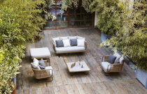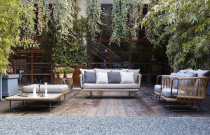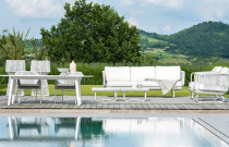 Venkovní sedací souprava, hliníková konstrukce, výplet syntetickým provazem, čalounění v outdoor látce s UV ochranou, odolné proti slané vodě i stopách po chlóru. Výplň pěna s drenážními otvory proti tvorbě plísně.