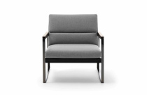 Čalouněné křeslo zn.Ditre Italia. Kovové područky zakončené dřevěným hranolem v odstínu eukaliptus. Čalounění v přírodní kůži. Nadčasový design a precizní zpracování.