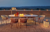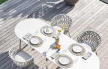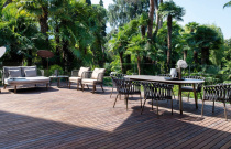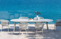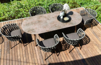 Venkovní jídelní stůl, lakovaná hliníková podnož nebo teakové dřevo. Top HPL kompaktní laminát nebo keramika. V nabídce více velikostí ve verzi fixní i rozkládací.