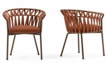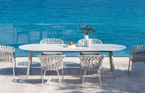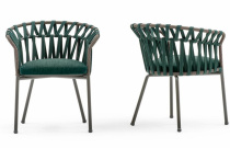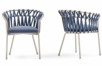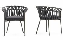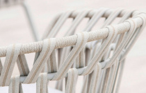 Jídelní židle, lakovaná hliníková konstrukce, výplet syntetickým provazem a tkaninou, čalouněný sedák v outdoor látce s UV ochranou, odolné proti slané vodě i stopách po chlóru. Výplň pěna s drenážními otvory proti tvorbě plísně.