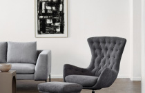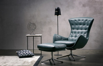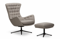 Čalouněné křeslo dánského výrobce Theca. Čalounění v látce nebo přírodní kůži. Kovová otočná podnož. Výborný komfort sezení. V nabídce i podnožník.