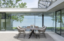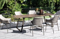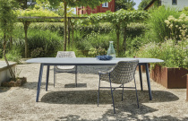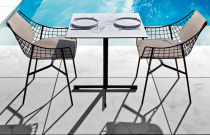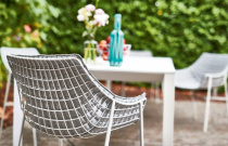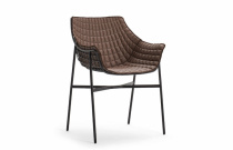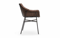 Jídelní židle, lakovaná kovová konstrukce, čalouněný sedák v outdoor látce s UV ochranou, odolné proti slané vodě i stopách po chlóru. Výplň pěna s drenážními otvory proti tvorbě plísně.