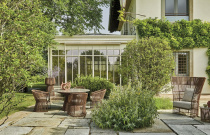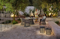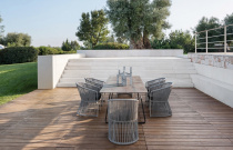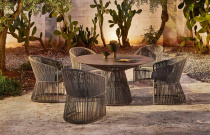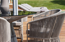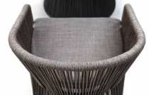 Jídelní židle, lakovaná hliníková konstrukce, výplet syntetickým provazem a tkaninou, čalouněný sedák v outdoor látce s UV ochranou, odolné proti slané vodě i stopách po chlóru. Výplň pěna s drenážními otvory proti tvorbě plísně.